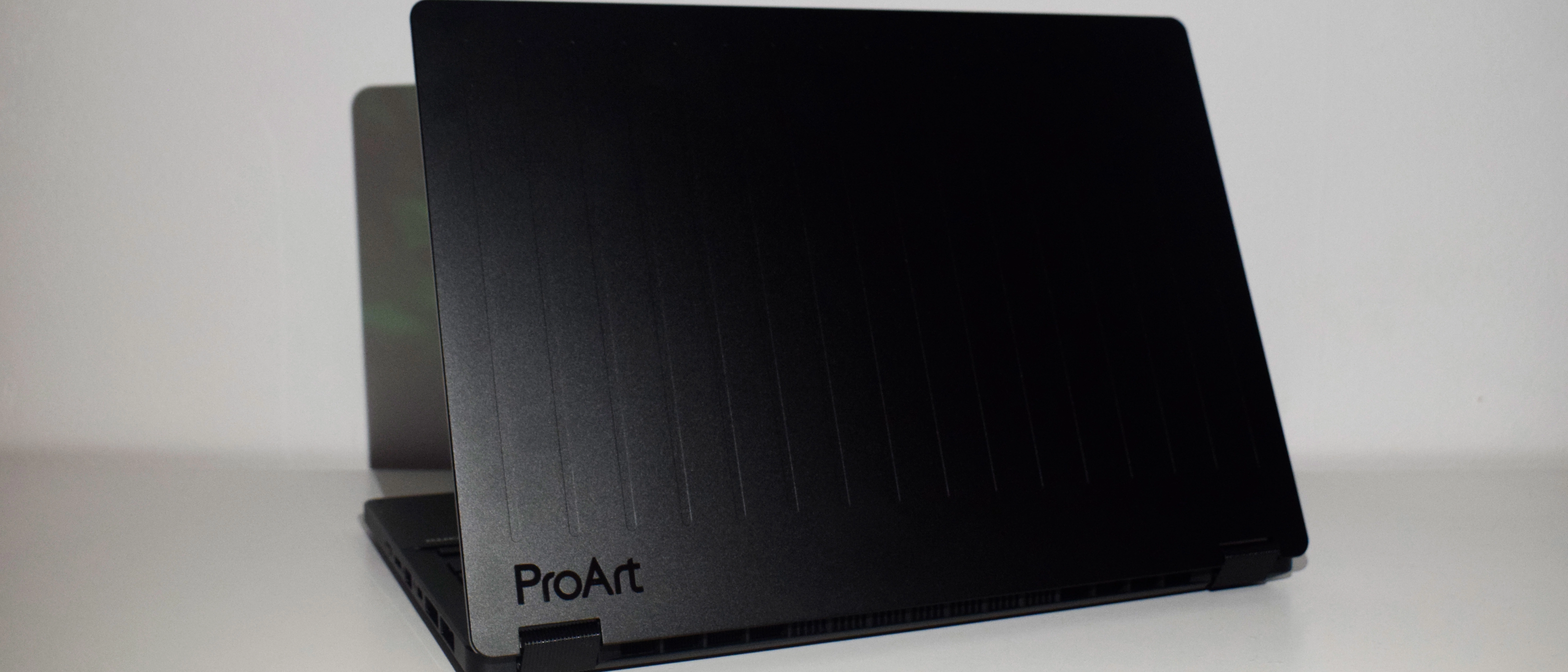 To start with, it's all black metal, which makes it look effortlessly cool. The keyboard has neon blue backlighting. And the lid has horizontal grooves for grip when you're on the go. Then there are the two logos in the top and bottom corners; one is a smaller 'GoPro' logo and the other, a slightly larger 'ProArt' one. Both are indents, so no attention-seeking colors. They just look good in an understated way. Ten out of ten, aesthetically.