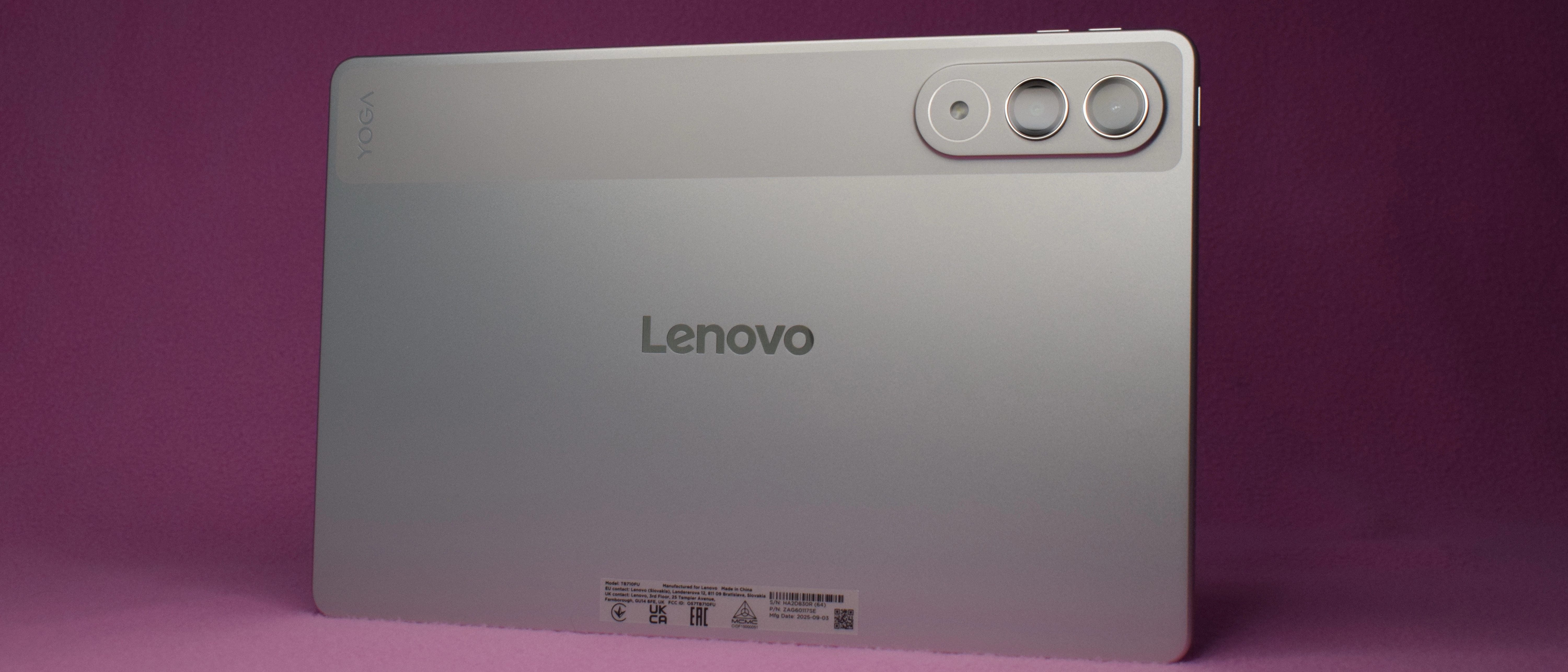 The Yoga Tab is a small slab, but it's oddly thicker at 6.2mm than the largest of Samsung's Galaxy Tab S11 models, the Ultra, 5.1mm. Our eyes were drawn to the two unusually large camera lenses on the back. They sit inside a long camera bump that also features a torch light – why you need this, we don't know. There are two separate shiny logos: a large one for 'Lenovo' and a corner one for 'Yoga'. Both add to the overall metallic look and feel of the device, which is quite striking in our opinion.