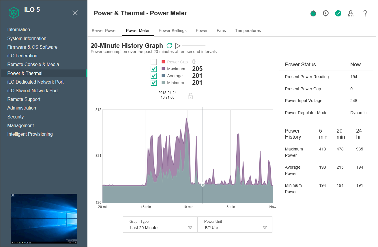 The iLO5 web interface is packed with useful information about critical components and if you upgrade to an Advanced or Essentials license, you'll get power metering, full OS remote control and virtual media services. We also added the server's iLO5 details to the lab's virtualized Hyper-V OneView app where we could closely monitor CPUs, power plus temperatures and use its tools for controlling power and running remote control sessions.