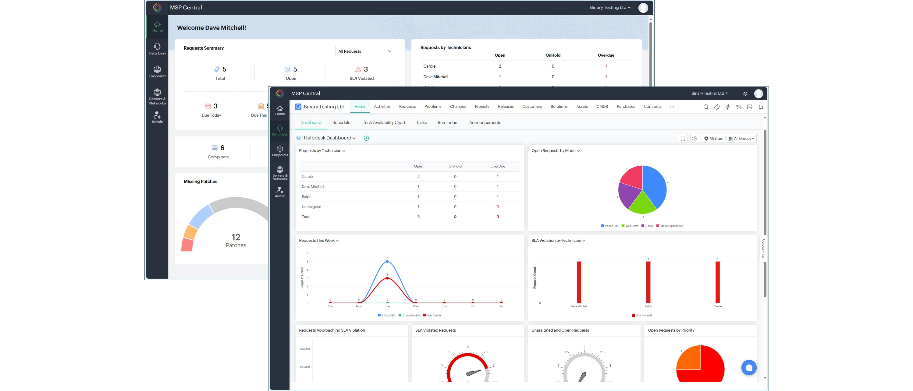 The help desk home page presents a detailed activity dashboard of all support requests, making it easy for admins to see who is handling them and those that have violated the service level agreements (SLAs) set for the customer. Each technician gets their own personal portal where they can view their current workload and create entries for support requests, incidents, problems, projects, and so on, and you can provide them with a range of custom templates to help streamline creation.