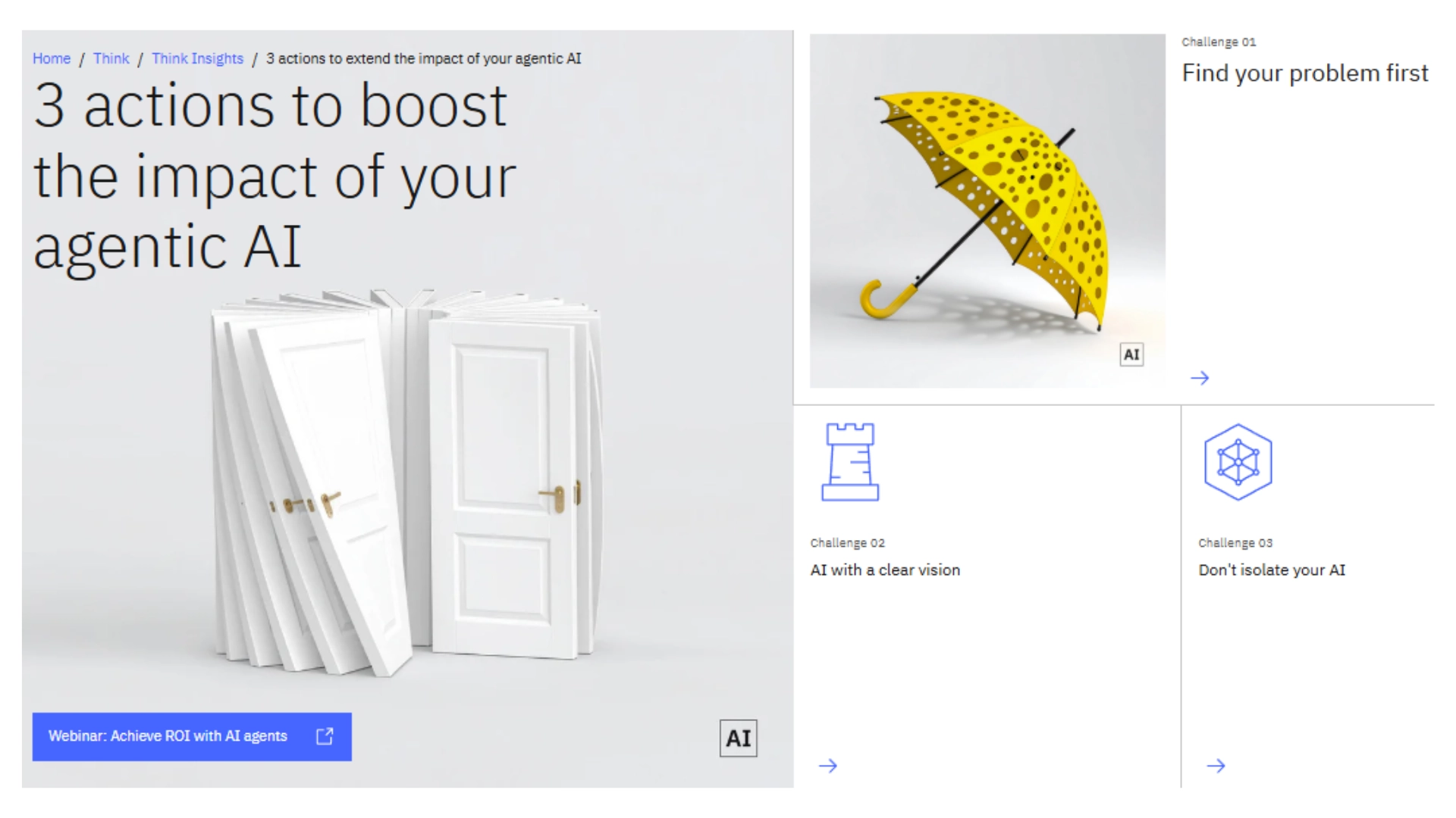 Businesses face many challenges on their journey from AI ambition to implementation. Success requires more than adopting new technology. It involves leveraging your data, choosing the right use case, and reimagining workflows to integrate AI at the core. Leaders must ensure the right AI is applied to the right challenges. Explore IBM’s playbook detailing three challenges and approaches you can take to help boost the impact of your agentic AI, including: